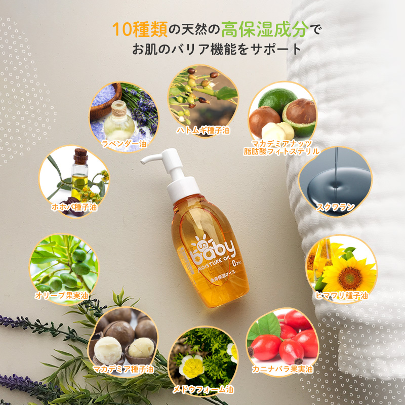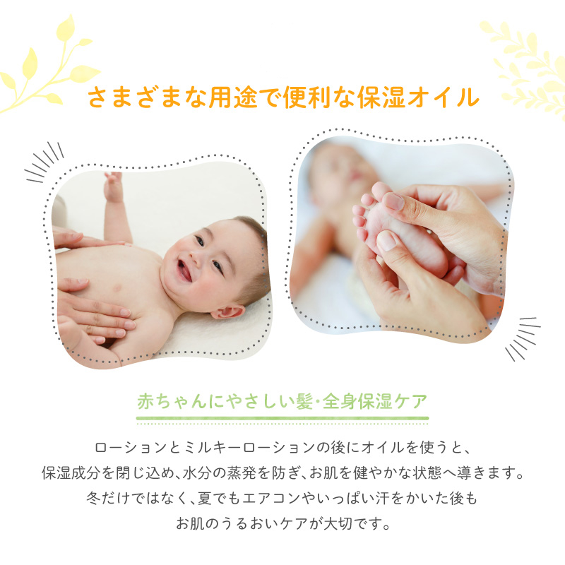 ●赤ちゃんのお風呂上りの保湿ケアやベビーマッサージ、ママの髪や全身の保湿ケア、敏感肌で悩んでいる方、お肌のカサツキが気になる部分にお使いいただけます。