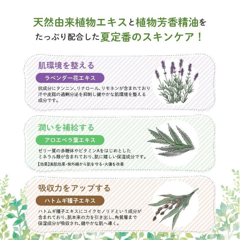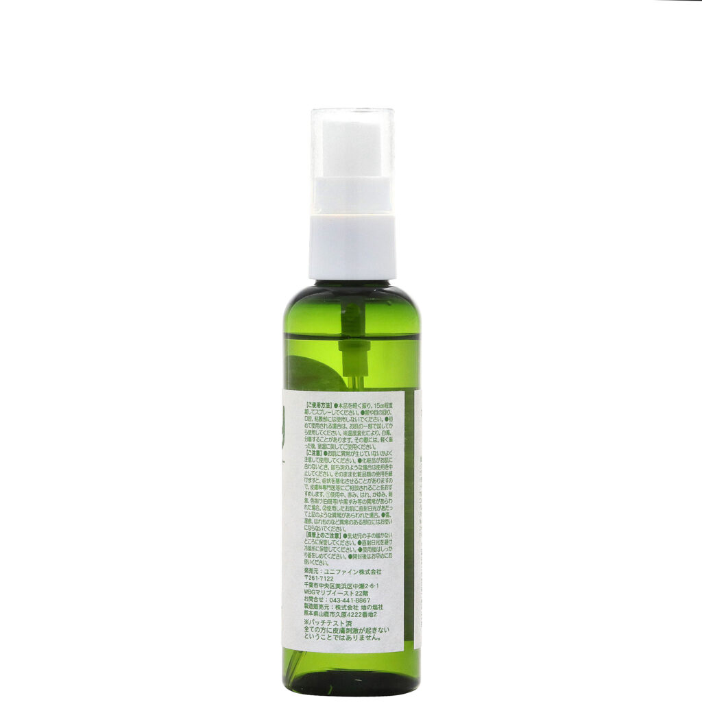 水、BG、グリセリン、ラウリン酸ポリグリセリル‐10、ヒドロキシプロピルシクロデキストリン、ハトムギ種子エキス、アロエベラ葉エキス、ラベンダー花エキス、ローズマリー葉油、ベルガモット果実油、コウスイガヤ油、ティーツリー葉油、セイヨウハッカ油、エンピツビャクシン油、ニオイテンジクアオイ油、香料、グリチルリチン酸2K、メンタンジオール、ジラウロイルグルタミン酸リシンNa、1,2‐ヘキサンジオール、カプリリルグリコール、エチルヘキシルグリセリン、トコフェロール、クエン酸、クエン酸Na
