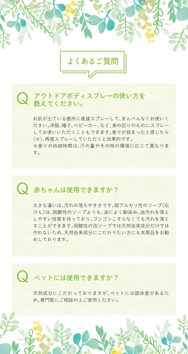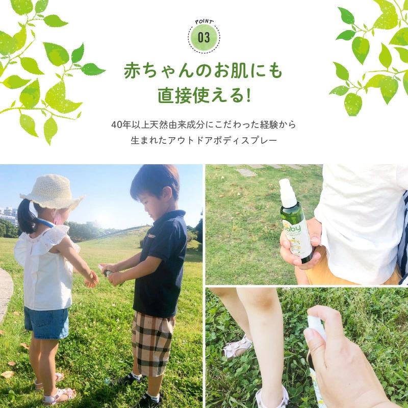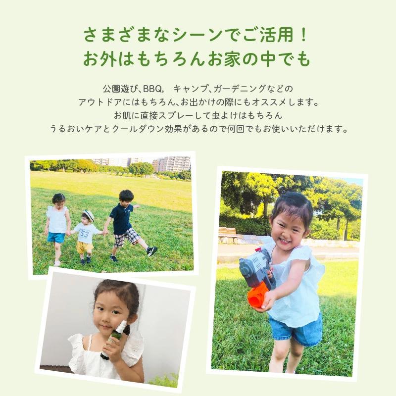 ●公園遊び、BBQ、キャンプ、ガーデニングなどのアウトドアライフにはもちろん、お出かけの際にもオススメの天然由来成分のボディスプレーです。